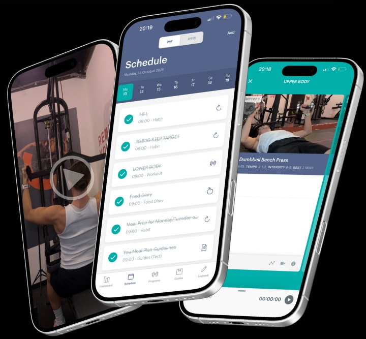 Total transformation experience with 1:1 coaching, personalised training and nutrition plans, weekly video check-ins, monthly progress calls, unlimited direct support, and a custom app to guide you every step. Full accountability and expert guidance for serious, lasting results.